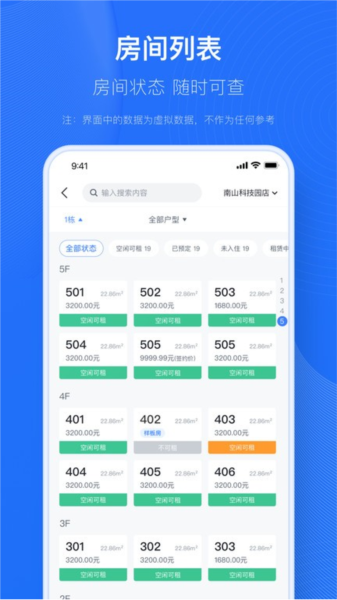 通过智能筛选和搜索功能,快速了解房源的出租状态、租期信息等,支持多种视图模式切换;