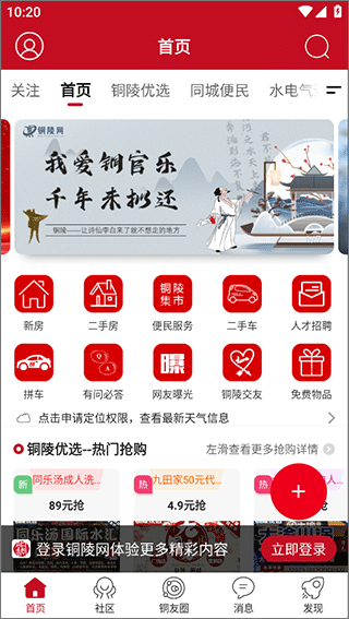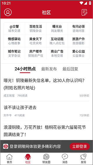 铜陵网app官方版是一款专为铜陵本地居民量身打造的生活服务类资讯平台,集社交互动、信息获取、生活服务于一体。在这里,用户不仅能浏览到丰富多彩的本地话题,还能与数十万铜陵网友实时互动交流,让生活更加便捷有趣。软件内容涵盖民生热点、情感交流、美食探店、亲子教育、户外活动、娱乐八卦、婚恋交友等多元化板块,满足不同用户的兴趣需求。您可以通过发帖分享日常生活点滴,阅读最新资讯新闻,随时随地掌握铜陵本地发生的大事小情,让平淡的生活变得丰富多彩。无论您是想要了解城市动态,还是寻找志同道合的朋友,铜陵网app都能为您提供贴心的服务,快来下载体验,加入铜陵人的线上大家庭吧!