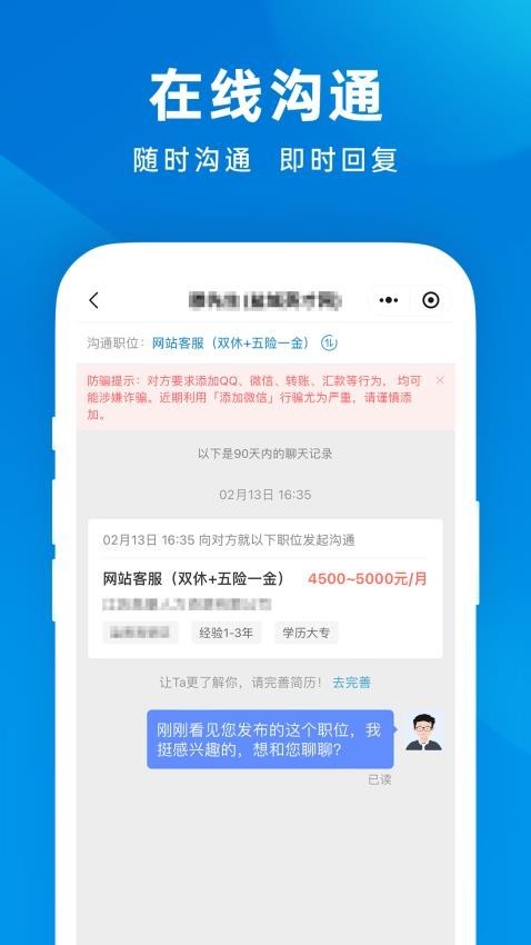 在线互动:一键在线打招呼,与求职者进行互动交流,相互了解,便于选择合适的人才。平台提供多种沟通方式,支持文字、语音、视频等多种形式的面试前交流。