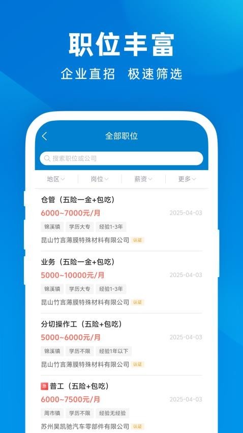 无论是制造业、服务业还是高科技产业,都收录了丰富的职位信息,满足不同求职者的多样化需求。平台特别关注昆山重点产业发展,为不同专业背景的求职者提供针对性的岗位选择。