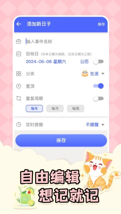 添加你的倒数日,可以提醒你到达日期时间。支持设置多个提醒时段,确保你不会错过任何重要时刻。