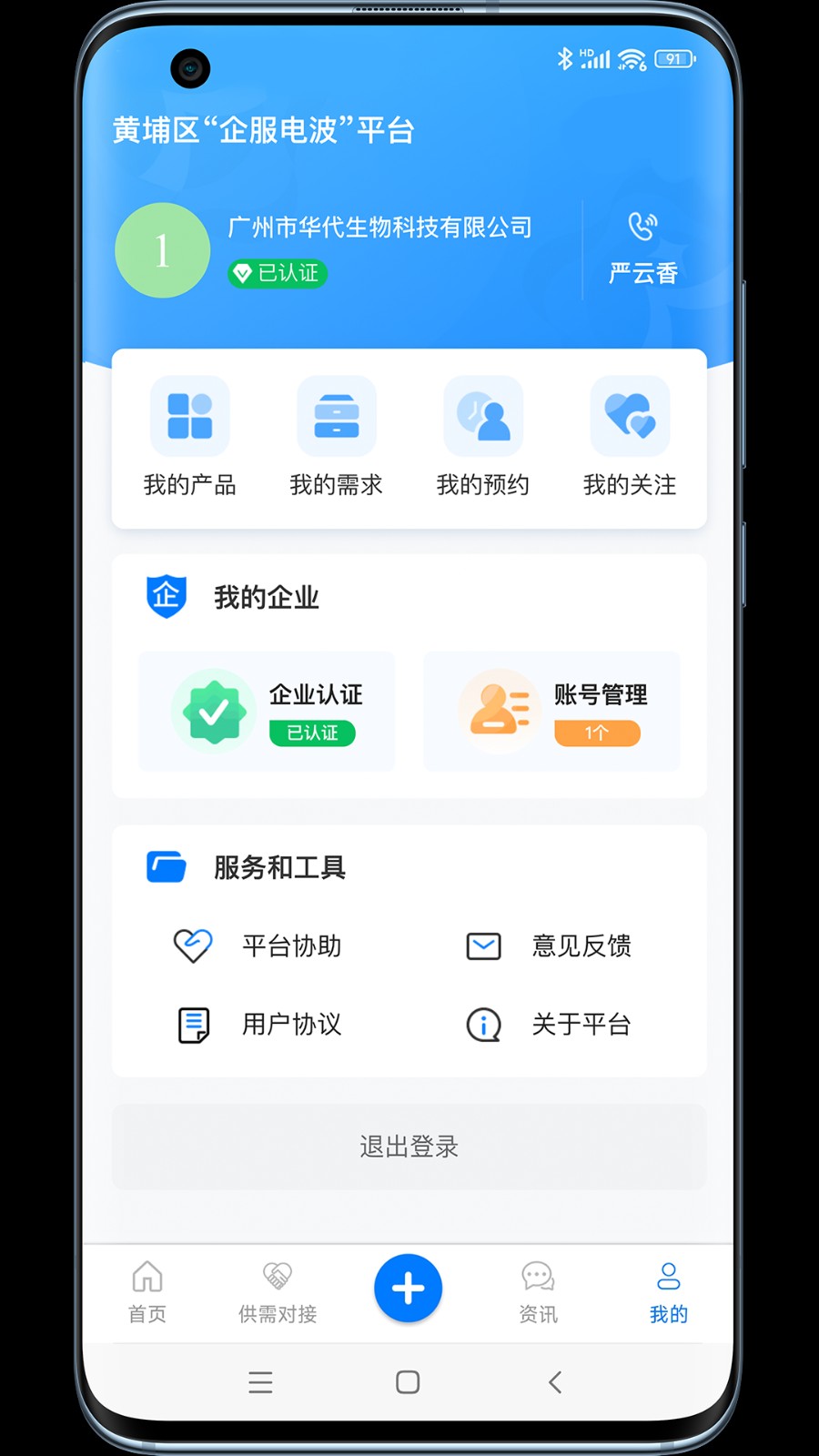 进入"我的"页面后可进行实名认证、管理企业信息、查看发布记录以及账户相关设定。个人中心整合了所有账户相关功能,包括消息通知、收藏夹、浏览历史、交易记录等,支持多账号切换和企业员工权限管理,确保企业信息安全可控。