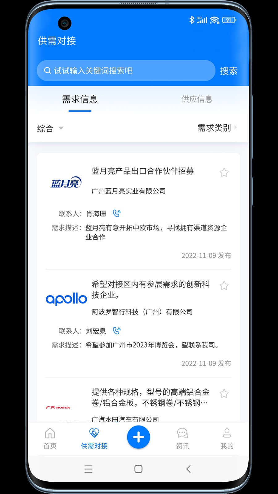 在"供需对接"页面,默认展示的是"需求信息"列表,用户可根据分类浏览并查找所需资源。页面支持高级筛选和智能推荐,可设置需求提醒,当有匹配资源出现时自动通知,帮助企业不错过任何商机,供需双方可通过平台内置IM工具直接沟通。