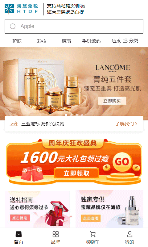 海旅免税城拥有海量正品商品,包括手表、首饰、香水、电子产品等45大类免税商品,近350个国际知名品牌任您挑选。所有商品均享受离岛免税政策,经国务院批准并由海关全程监管,品质有保障。购物流程简单便捷,支持手机下单,可选择三亚、海口、琼海(博鳌)机场、轮渡或火车站提货,也可选择邮寄到家,省去排队烦恼。海旅免税城秉承"欢乐购随心游"的经营理念,不断创新,致力于为消费者提供优质的产品和服务,打造安心舒适的购物体验。