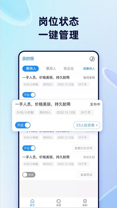 余时保中介版有效解决了企业季节性用工、临时用工等特殊需求,显著提升人力资源管理效率。平台致力于为求职者创造更多就业机会,通过智能推荐算法精准匹配个人技能与岗位要求。首页个性化推荐系统会根据用户浏览记录和偏好,智能推送最相关的工作机会,帮助用户快速了解岗位详情。