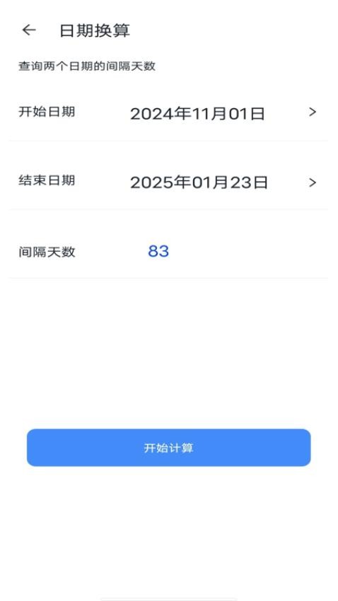 支持任意两个日期之间的天数计算,可精确到小时分钟,特别适合计算套餐有效期、合约到期日等情况,计算结果直观清晰。