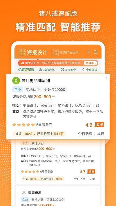【精准匹配】依托猪八戒网多年积累的大数据资源,平台开发了智能匹配系统。用户只需10秒发布需求,系统就能从全国2265个城市的服务商中精准筛选出最合适的人选。这种高效的匹配机制,大大缩短了企业寻找合适人才的时间成本。