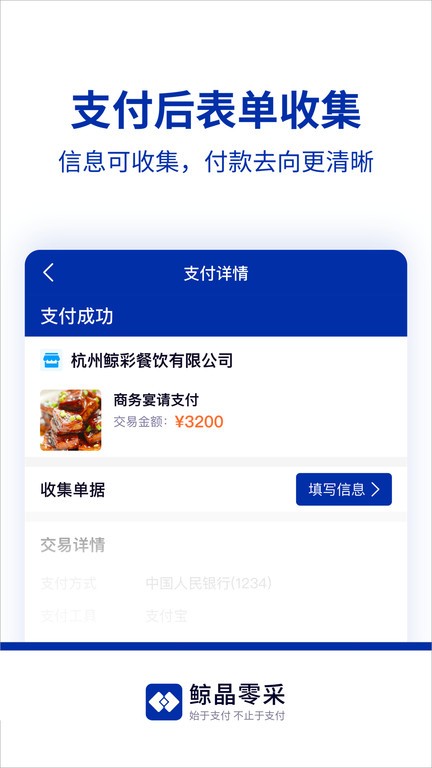 鲸晶零采app是由杭州鲸晶智能科技有限公司倾力打造的一款专业企业支付安全管理软件。作为鲸彩时刻旗下的核心产品,该软件以支付安全为核心,致力于为企业提供全方位的数字化支付解决方案。通过先进的技术手段和严谨的风控体系,确保企业支付过程的安全可靠,有效防范各类金融风险。