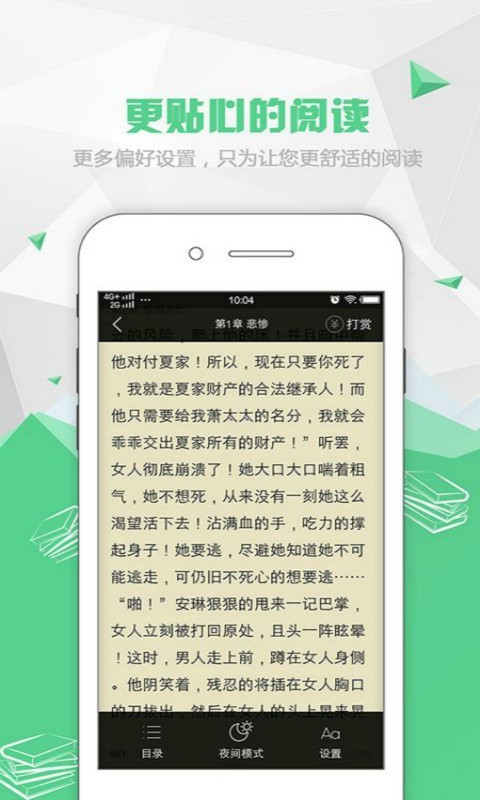 提供六个独立书架和六种阅读主题,支持亮度调节和夜间模式切换,有效保护视力健康。