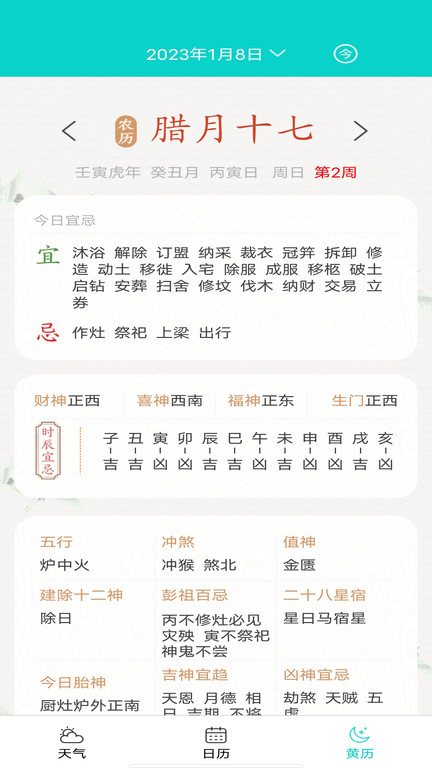 使用日历功能时,您可以在对应板块自由切换月历或周历视图,查看节日、节气等日期相关信息。黄历内容直接显示在界面上,方便您了解当日的传统宜忌事项,为生活决策提供参考。
