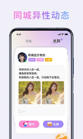 这里有大量的实名认证用户,覆盖全国主要城市,你可以在这里随意交友。平台每日活跃用户超过百万,总能找到与您投缘的朋友。发布自己的动态,支持文字、图片、短视频等多种形式,分享自己的日常生活,可以让你获得更多关注。优质内容还会获得平台流量推荐。您可以通过简单的操作创建私人聊天并与好友聊天,支持阅后即焚等隐私保护功能。你还可以看别人发布的动态,通过点赞评论互动,寻找与你灵魂相匹配的人。平台还会定期举办线上主题活动增进交流。
