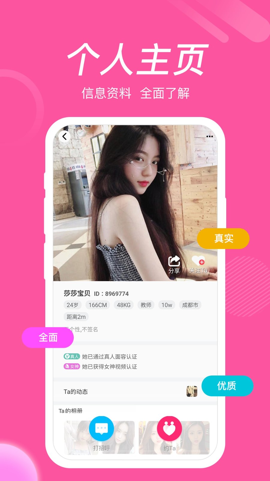 【品质认证】我们设立了严格的女神认证体系,只有颜值与内涵兼备的优质女性才能获得认证标识,确保交友质量。