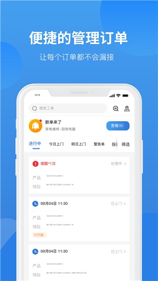便捷的订单管理系统,按照预约时间自动排序,让工程师的工作安排更加合理高效。家居维修用户可快速在平台上下单,填写详细的服务产品信息,确保工程师能够准确了解维修需求。智能计价器采用科学算法,为维修师傅和用户提供公平透明的价格参考,避免价格纠纷。强大的搜索功能支持通过工单名称或编号快速检索,帮助工程师精准定位目标订单。自定义闹钟提醒功能可根据订单预约时间设置多次提醒,确保不会错过任何重要服务。