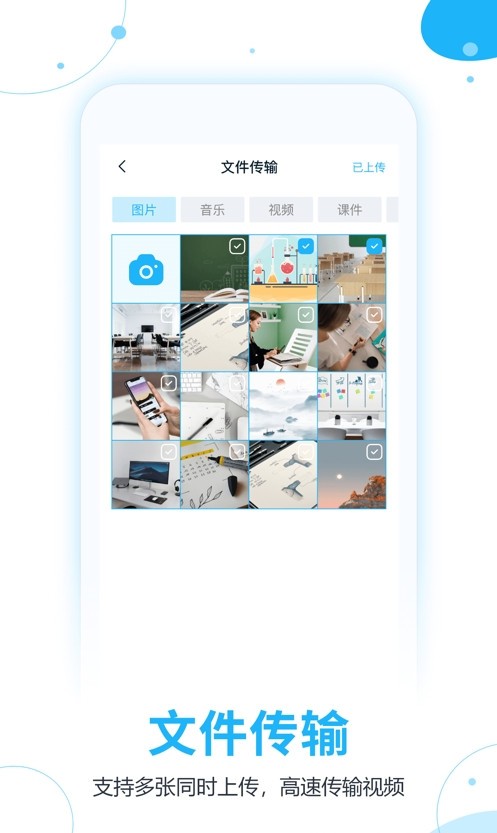 支持多张照片上传,高速传输视频文件支持声音。内置智能带宽调节功能,可根据网络状况自动优化传输质量。支持批量文件传输,最大可同时处理50个文件。