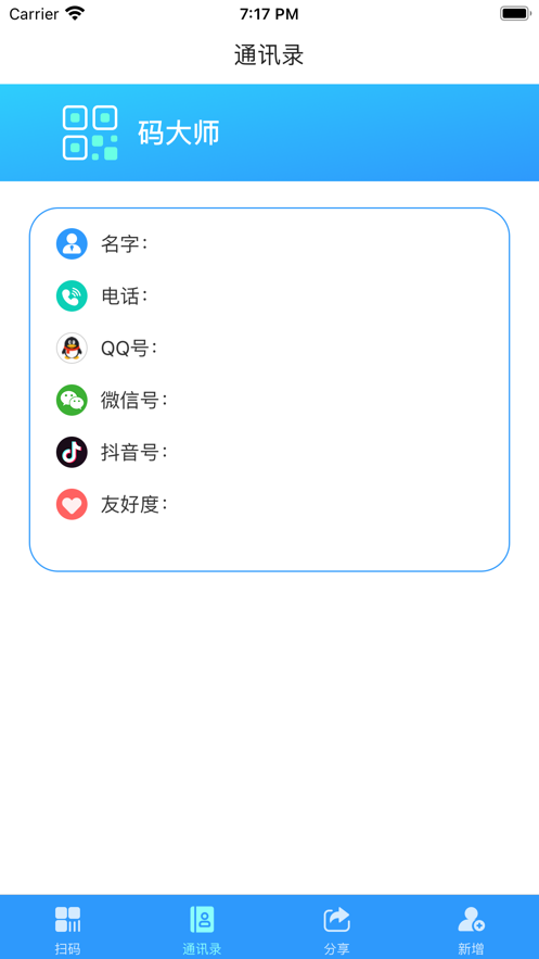 码大师是一款功能强大的二维码生成与管理工具,专为现代用户设计,满足多样化需求。软件界面简洁直观,操作流畅,即使是新手也能快速上手。它支持生成多种格式的二维码,包括网址、文本、联系方式等,还能自定义二维码样式,让您的名片或信息更具个性化。无论是商务交流还是日常使用,码大师都能为您提供高效便捷的解决方案。此外,软件还具备批量生成和分享功能,大幅提升工作效率。快来下载体验,让码大师成为您生活中的得力助手!