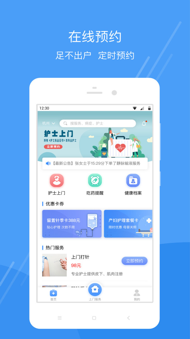 【护士上门服务】我们精心设计了11项常规护理操作,包括上门打针、静脉采血、普通换药、PICC换药、导尿、留置胃管、吸痰、压疮护理、造口护理、灌肠护理、外科拆线、雾化治疗等。这项服务能有效减少患者及家属往返医院的奔波之苦,让专业护理服务走进千家万户。