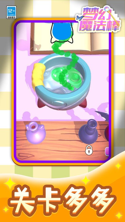 《梦幻魔法棒》是一款令人着迷的休闲创意手游,为玩家打造了一个充满想象力的魔法世界。在这个奇幻的冒险中,你需要运用智慧将各种魔法材料放入坩埚,按照配方精心调配出神奇的魔法药水。随着游戏的深入,你将解锁更多强大的法术和稀有资源,通过不断尝试新的配方组合,创造出独一无二的魔法物品。游戏还设置了丰富多样的探索内容,让你可以穿梭于不同的魔法地图,发现隐藏的神秘法术和惊喜彩蛋。