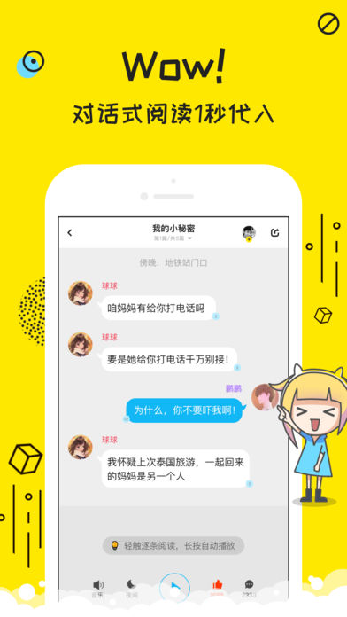 颠覆传统阅读体验:告别单调的文字排版,采用对话式轻阅读设计,让你在指尖滑动间就能享受流畅的阅读体验,5秒快速代入故事情境,获得前所未有的互动阅读快感。