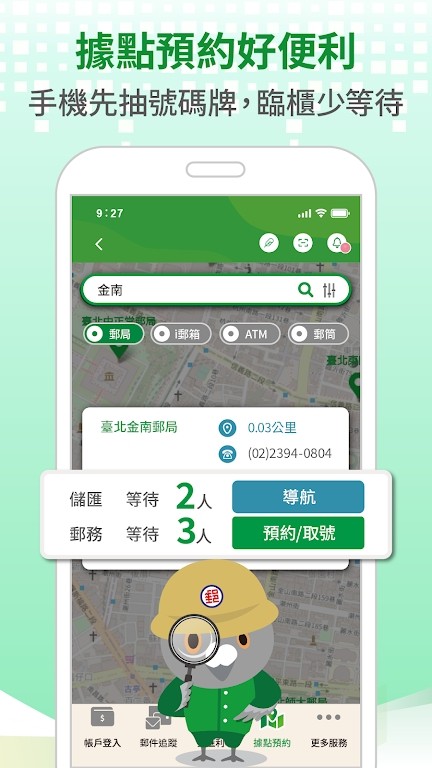 据点预约:行动邮局服务预约好便利,线上先抽号码牌和填单,临柜免等待。用户可以在APP上提前预约附近邮局的服务时段,填写电子表单,到现场直接办理,大幅节省排队等候时间,提高办事效率。