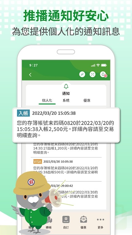 推播通知:行动邮局推播通知好安心,为你提供个人化且即时的通知讯息。系统会根据用户的使用习惯和业务需求,智能推送各类重要提醒,包括账单到期、转账到账、邮件投递状态等,确保用户不会错过任何关键信息。
