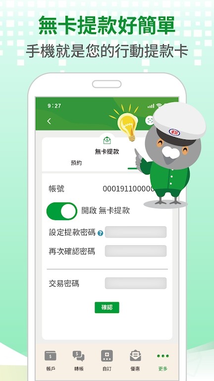无卡提款:无卡提款好简单,手机就是提款卡,不带钱包也能领。用户只需在APP上生成取款码,即可在全台邮局ATM完成取款操作,彻底摆脱实体卡片的束缚,享受移动金融的便利。