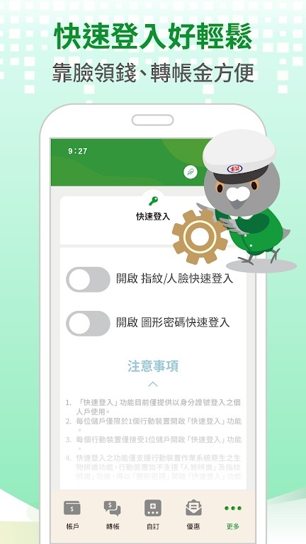 为维护网路交易安全,行动邮局采用TLS1.1及TLS1.2加密协定作为资料传输保护机制,目前最低支援作业系统版本为Android6.0或iOS11.0以上版本,非属上述版本,建请先行升级作业系统或更换支援之行动装置。系统还配备了多重身份验证机制和实时风险监控系统,确保每一笔交易都安全可靠,让用户可以放心使用各项金融服务。