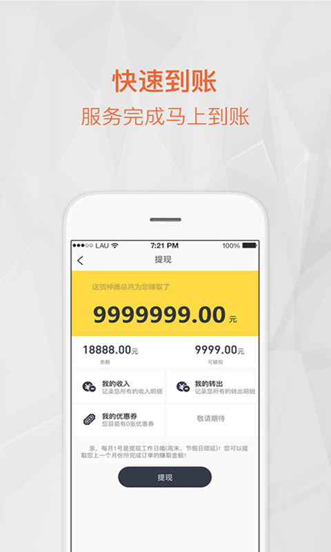 快速到账服务完成马上到账,资金安全有保障,支持多种提现方式