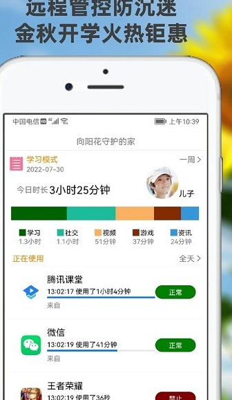 多种使用模式:向阳花守护内置开放、学习、禁止三种模式,适应不同场景需求,让管理更灵活。家长可以根据孩子的作息时间、学习任务等情况,一键切换适合的模式,确保孩子在不同时段都能合理使用电子设备。