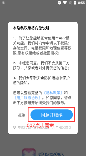 首次打开软件时请仔细阅读并同意用户协议和隐私政策