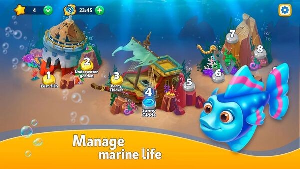 游戏最新版本带来了更多精彩内容!玩家可以从零开始重建一个融合了幻想与魔法的全新海底世界。通过合并不同的元素,玩家可以收集各类资源,建造包括鱼屋、矿山、宝石仓库等多种功能性建筑,逐步扩展自己的海洋营地。游戏新增了数十种独特的海洋生物,如火鱼、发光鱼、软泥鱼等,等待玩家去发现和收集。特别值得一提的是,玩家需要清除海底的有毒墨水污染,让这片魔法海域重现往日的辉煌与荣光。