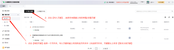 小绿鲸阅读器支持PDF和CAJ格式文献导入(注:CAJ格式暂不支持Pad端)。用户可在【我的文献】中选择特定文件夹进行归类存储,或直接上传至根目录。系统提供两种高效导入方式:单篇文献可通过点击导入按钮或直接拖拽文件至界面完成;多篇文献则需按住Shift键批量选择,支持一次性导入数十篇文献,大幅提升文献整理效率。