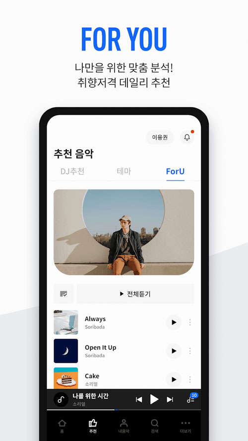 Soribada经过多次优化升级,现在的主菜单设计更加直观易用。用户可以根据当下心情选择"主题音乐"标签,快速找到匹配情绪的音乐类型。"ForYou"功能会为用户量身定制专属音乐推荐,而"我的音乐"则完整记录用户的音乐历程和故事。平台界面经过重新设计,操作流程更加流畅,即使是新用户也能快速上手。