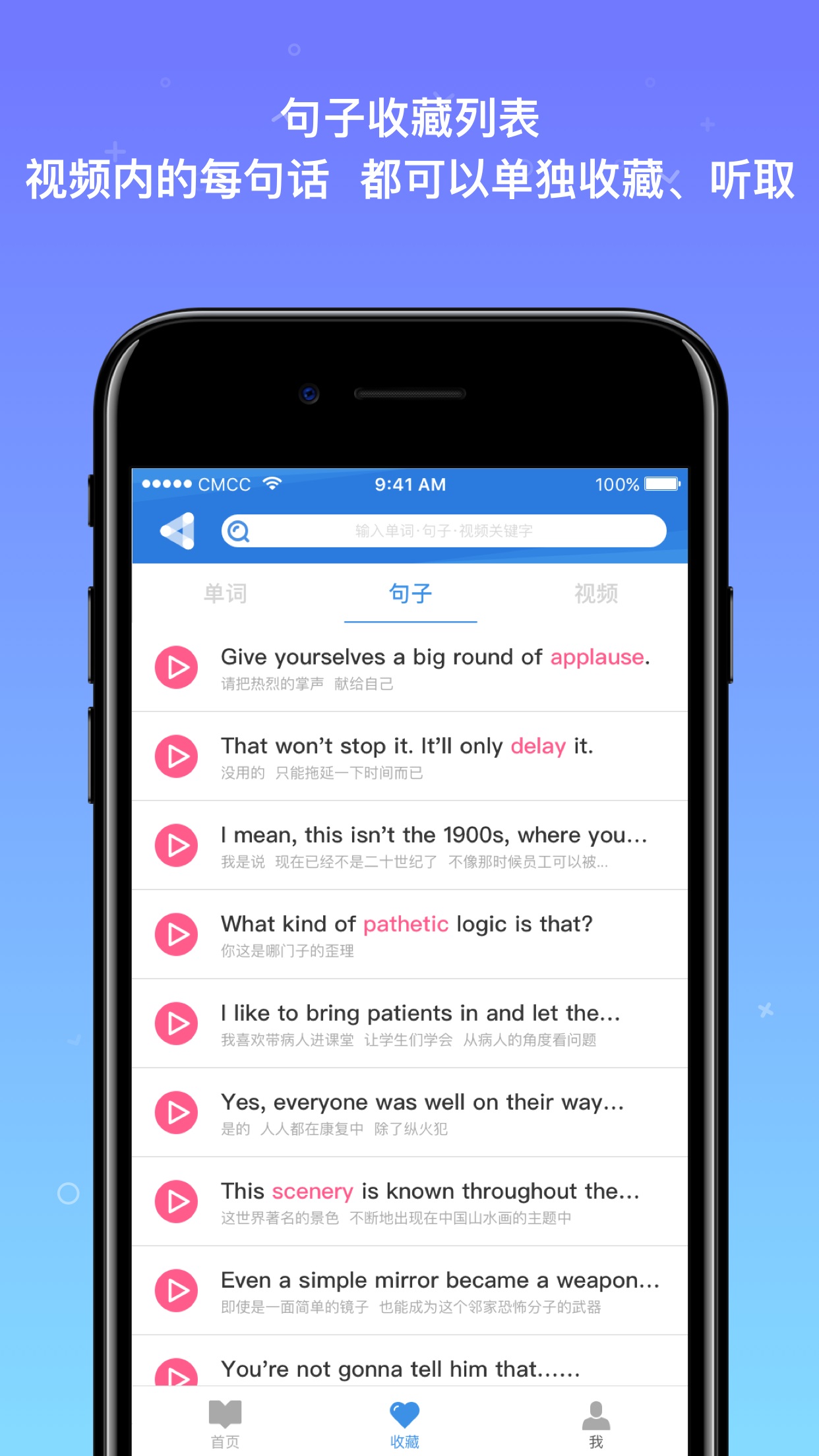 不仅仅是单词本,视频中每句话也可以单独收藏,反复播放。收藏的句子会自动生成填空练习,用户可以通过补全句子来巩固记忆。系统还提供句子跟读功能,实时评估发音准确度。