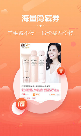 商品种类应有尽有,包括女装男装、美妆护肤、鞋包配饰、生活百货、生鲜零食、家电数码、母婴用品、运动户外等各个品类。同时整合了淘宝、天猫、京东、苏宁、唯品会等多个主流电商平台的优惠资源,并精选蘑菇街、美丽说、折800等特卖专场的优质商品,让您一站购齐所需。
