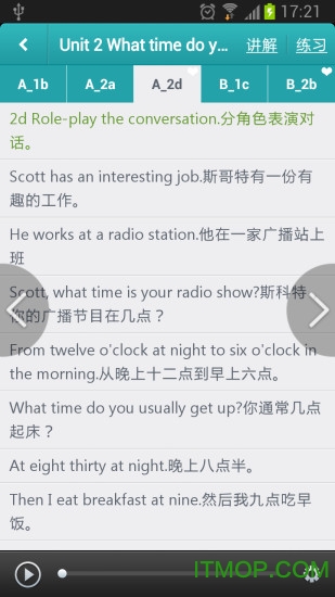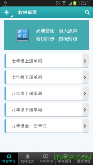☆同步教材内容:完整收录人教版七年级至九年级的单词和课文,每篇课文都配有专业翻译,并采用高清真人发音,支持跟读和点读功能。