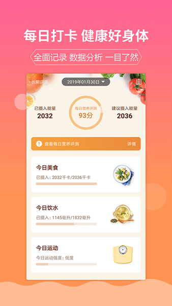 健康打卡:鼓励用户记录每日饮食情况,培养健康的饮食习惯。通过持续的饮食打卡,帮助用户建立科学的膳食结构,远离亚健康状态。系统会根据打卡记录提供改进建议,让健康生活成为一种习惯。