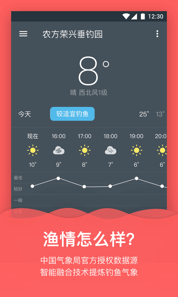 中国气象局官方授权天气数据,智能融合技术提炼与钓鱼相关气象参数,给出钓鱼建议和24小时渔情活跃度参考。系统会根据气压、温度、湿度等关键指标,智能分析最佳垂钓时段,让您不错过任何上鱼良机。