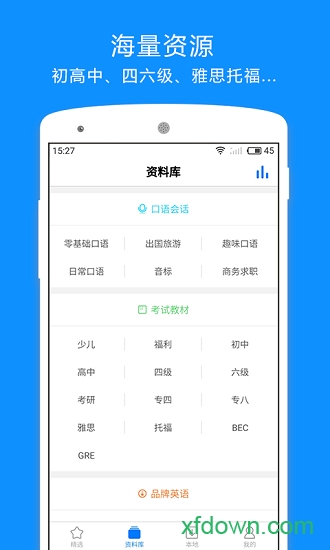 海量的音频学习资料涵盖日常对话、常用单词、实用句型等内容。纯正的英语发音示范,让您可以随时随地练习听力,培养语感,逐步练就地道自然的英语口语表达能力。