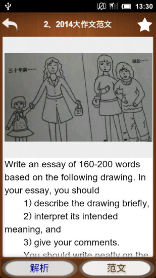 考研英语作文真题是一款专注于考研写作训练的优质应用。软件不仅收录了近20年的考研英语大小作文真题,还提供了详细的解析和优质范文。每篇作文都配有专业的中文翻译,帮助考生准确理解题目要求;同时分析历年出题动向,让备考更有针对性。范文部分精选高分佳作,并提炼出实用的黄金句型,方便考生模仿学习。此外,软件还支持离线使用,让学习不受时间和地点限制,真正实现随时随地提升写作能力。