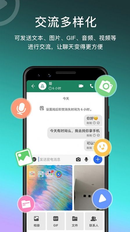 以端对端加密的方式发送文本、图片、GIF、视频等多种媒体内容进行互动交流,所有文件传输都经过严格加密;