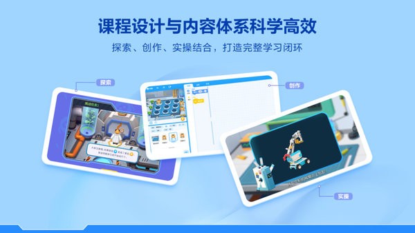 探索课、创作课和实操课三种课程形式科学排布,打造完整高效的学习闭环。探索课中以动画闯关解锁编程知识,有趣的互动操作激发孩子持续学习的动力;创作课中综合项目进阶挑战,应用创作融会贯通;实操课中软硬件结合编程训练,用编程知识解决实际问题,学以致用。课程难度梯度设置合理,确保每个孩子都能找到适合自己的学习节奏。