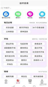 会恋话术拥有精心设计的三大功能界面,包括聊天技巧界面、爱情语录界面和最佳聊天回复界面,用户可以根据不同场景和需求自由选择使用。平台每天都会更新大量原创对话内容,这些素材经过专业团队精心打造,确保每一句话术都实用且富有感染力。此外,软件还会定期推出热门交友话题,用户不仅可以浏览有趣的话题内容,还能参与讨论发表自己的观点,在互动中提升社交能力。