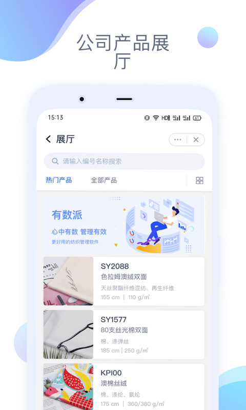 作为纺织行业数字化转型的得力助手,有数派软件集成了产品管理、生产管理、订单管理、仓库管理和财务管理五大核心模块,为企业提供全方位的业务支持。通过智能销售系统、智能验布功能和数字化管理工具,有效提升纺织企业的工作效率,降低运营成本。其强大的数据分析能力更能实时驱动管理决策,让企业管理者随时掌握经营动态,做出精准判断。