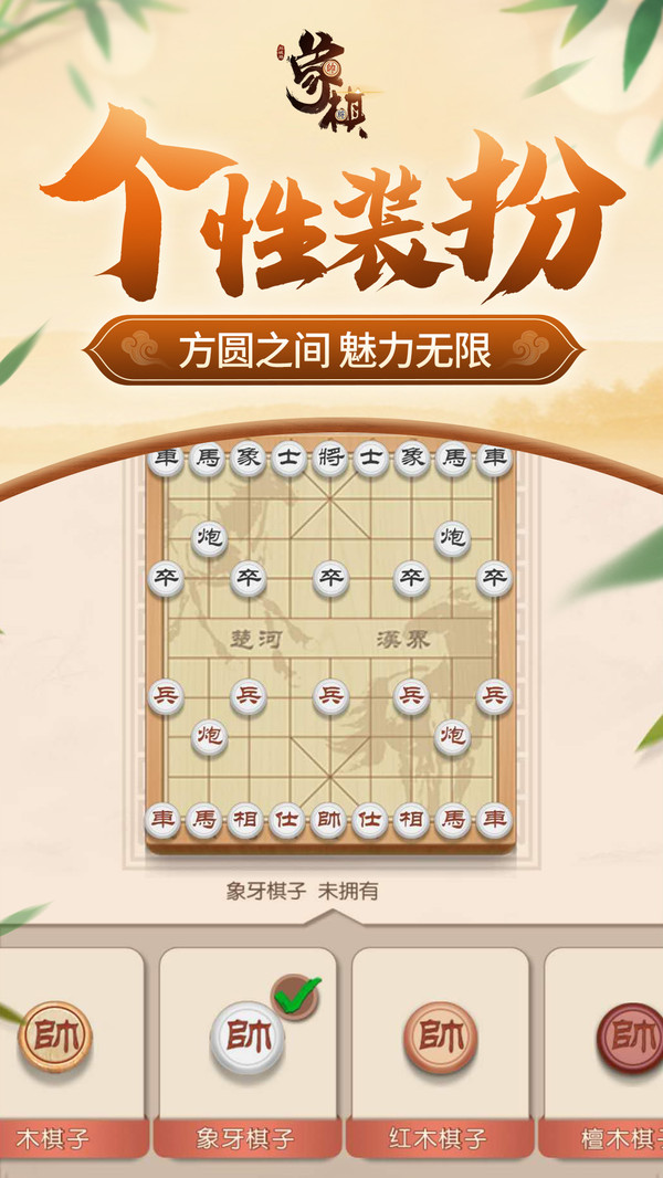 个性相框、象牙棋子。每月签到可收集十二生肖鎏金棋盒,VIP玩家更可定制个人专属棋具套装。