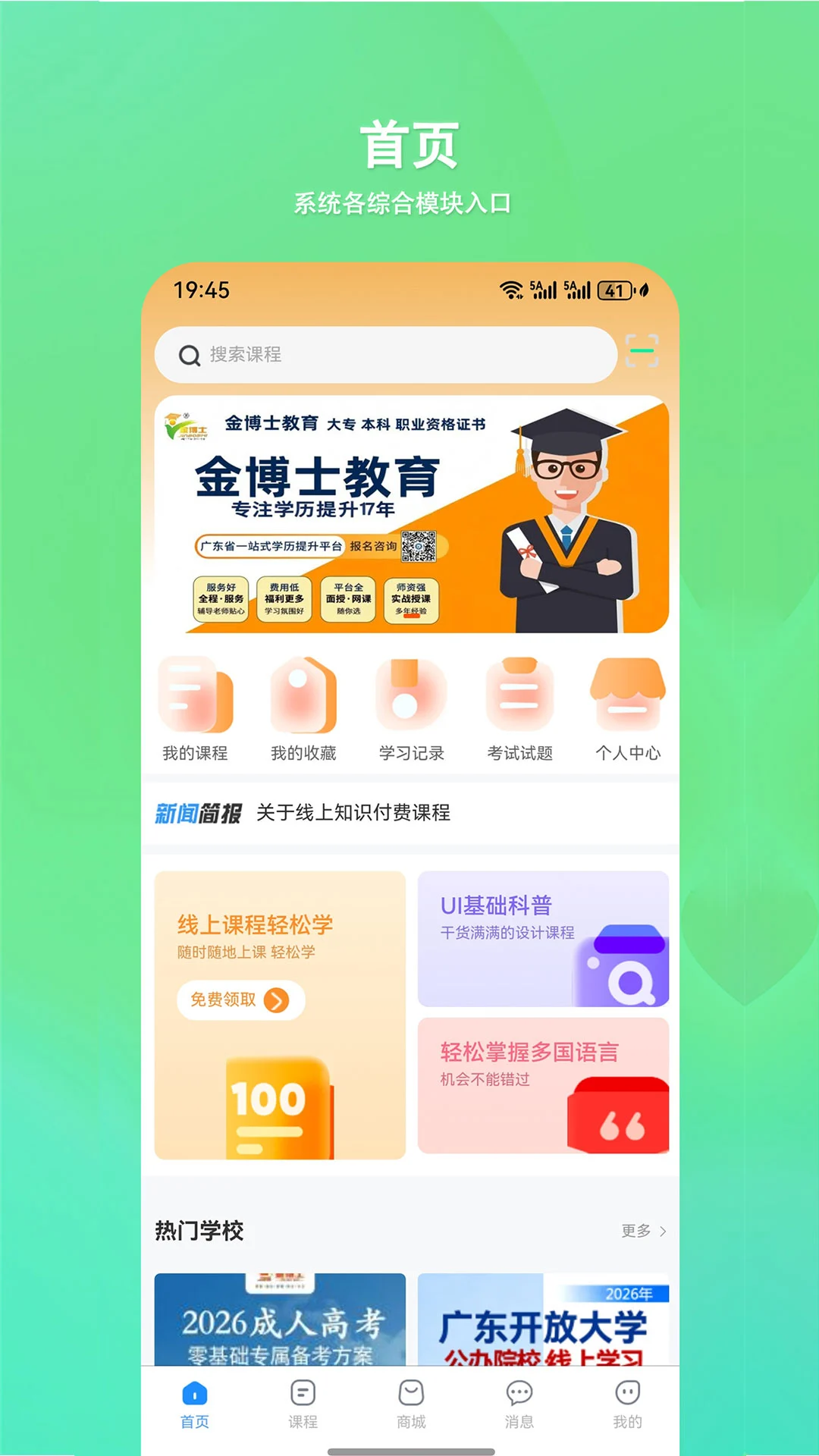 金博士求学通是针对线上辅助成人学历提升的刷题应用,方便快速对以前的真题进行训练。金博士教育是一家成人学历高等教育机构,涵盖成人高考、自考、网络教育、职业资格证书等培训内容,是深圳市龙华区教育局批准办学的正规成人教育培训学校,主要经营范围是成人高考辅导和自考辅导。