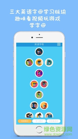 应有由多个模块组成:视频听英语字母儿歌模块,学习练发音模块,手写练习26字母书写模块,连连看模块。每个模块都配有生动有趣的动画效果,激发孩子学习兴趣。特别是字母儿歌,旋律朗朗上口,帮助记忆。