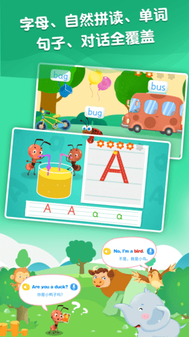 包含完整的英语学习体系:26个字母书写教学、36首经典英文儿歌、26个自然拼读规则、268个常用单词、256个实用英语对话以及144个基础句式。这些内容经过专业教育团队精心设计,循序渐进地提升孩子的英语能力。