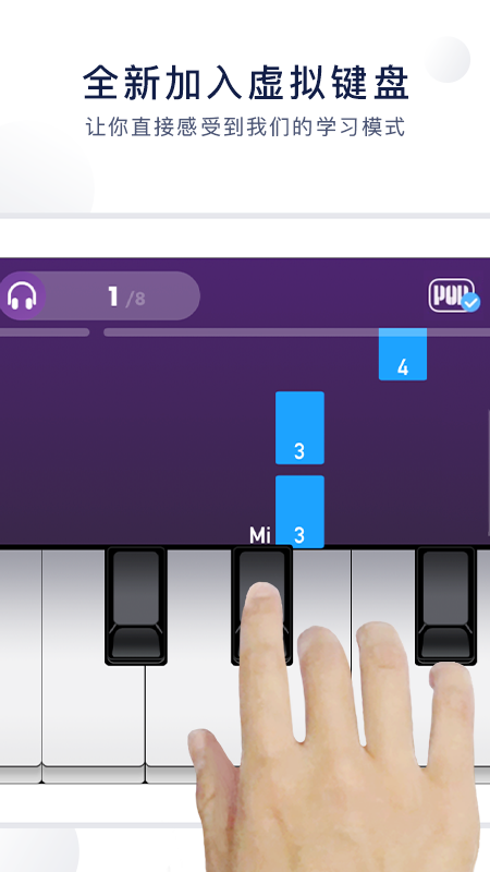 智能键位提示:当音符落下时,对应的琴键会亮起提示,用户只需跟随提示按下正确的琴键即可,完全不需要事先掌握五线谱知识。