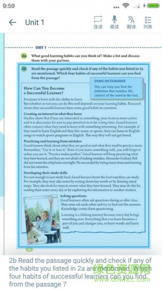 贴心的逐句翻译功能,把课文按句拆分,易学易懂,让你不再面对大段译文无从下手。翻译内容经过专业校对,既保持原意又符合中文表达习惯。重点句型还会额外标注语法解析,帮助学生深入理解句子结构。