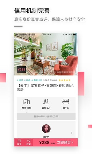 小猪短租的亮点在于其丰富的房源类型和多样化的风格选择。平台上不仅有民宿、客栈、公寓等常见类型,还有老洋房、树屋等特色房源,满足不同用户的个性化需求。用户可以随时随地在APP上挑选房源,不受时间和地域限制,还能通过详细的房源信息和在线沟通功能,全面了解房源情况。对于海外出游的用户,平台还提供了聊天翻译功能,解决语言沟通障碍。
